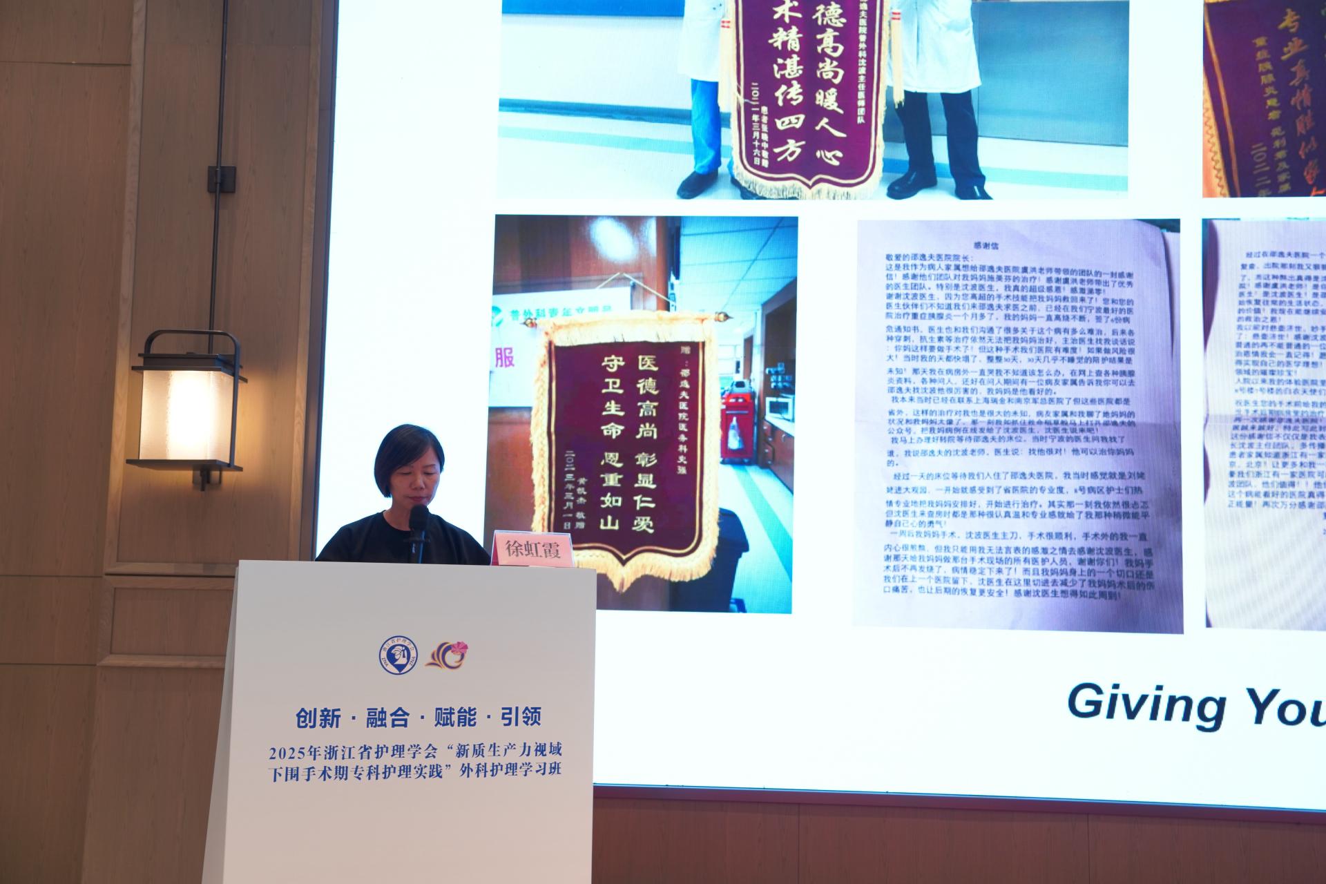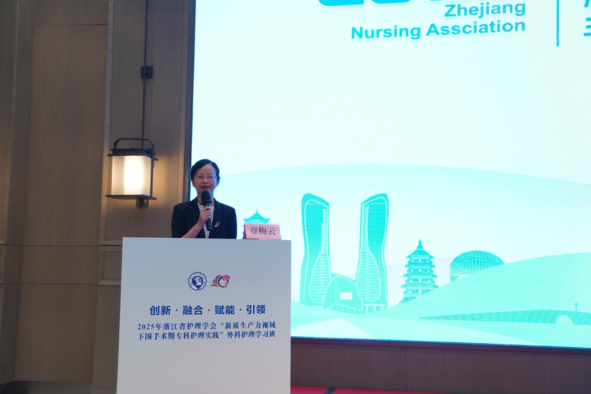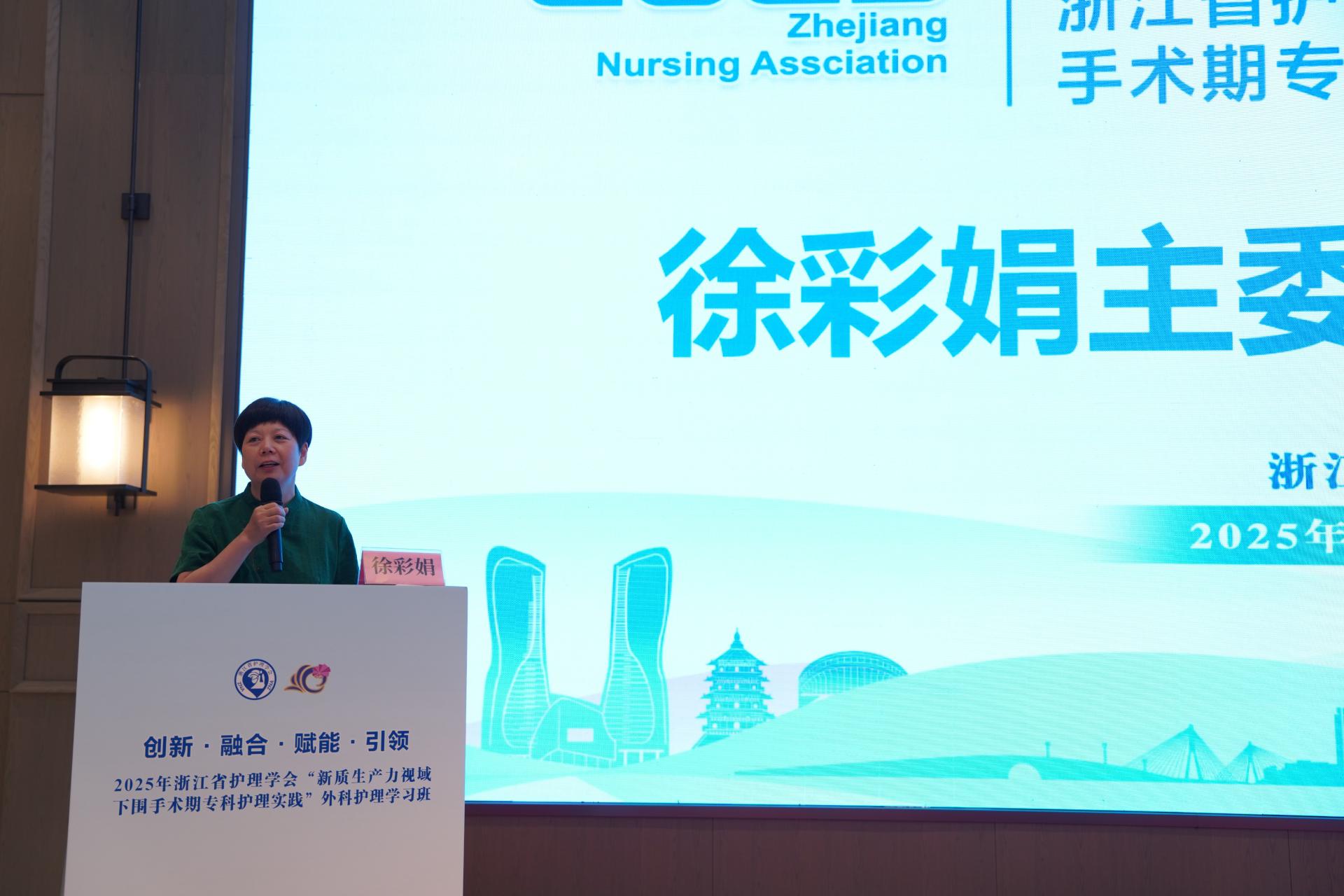 浙江省护理学会外科专业委员会徐彩娟主任委员致欢迎辞。她指出在当前外科领域技术革新的背景下,护理人员必须主动拥抱变革,持续学习新技术、新方法,并将其融入临床实践与护理创新。她希望全体学员珍惜此次机会,积极交流、深入思考,将所学转化为推动护理高质量发展的实际动力,共同为我省外科护理事业发展贡献力量。