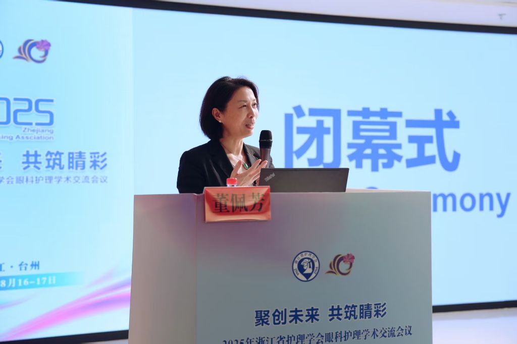 闭幕式上,浙江省护理学会眼科护理专业委员会副主任委员董佩芳作会议总结:本次会议聚焦眼科护理发展前沿,课程体系精准覆盖数智赋能护理升级、AI技术临床转化、互联网+护理服务创新、日间手术精细化管理、专科护士培养体系等核心领域,更立足“健康中国2030”战略导向,围绕行业智能化转型、中西医结合护理实践、全周期健康管理等热点议题展开深度剖析与前瞻性探讨,为全体参会代表们呈现了一场既有前沿高度又具实践深度的学术盛宴,为今后临床护理工作提供了重要启示与实践思路。
