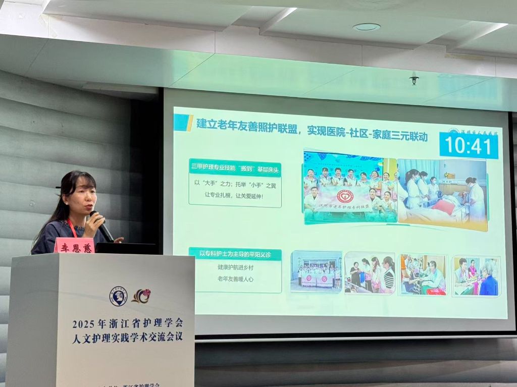 专委会委员、温州市人民医院大内科总护士长李恩慈聚焦老年护理领域,详细讲解了《基于ICOPE 框架构建老年友善护理新模式》。她从宏观、中观、微观三个层次,阐述了如何构建友善管理、环境、沟通、体验到文化建设,强调在老年人整合照护中,要兼顾其自主需求与情感体验,这一模式体现了对老年患者的全面关怀,为老年护理工作提供了新思路和方向。