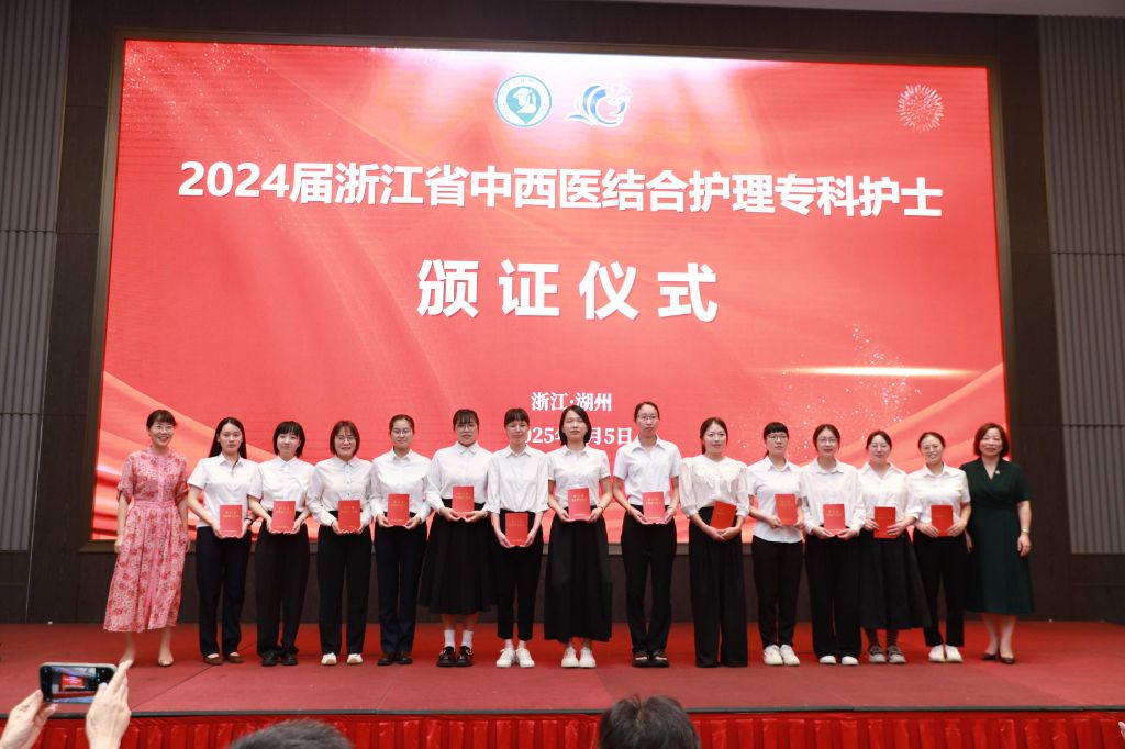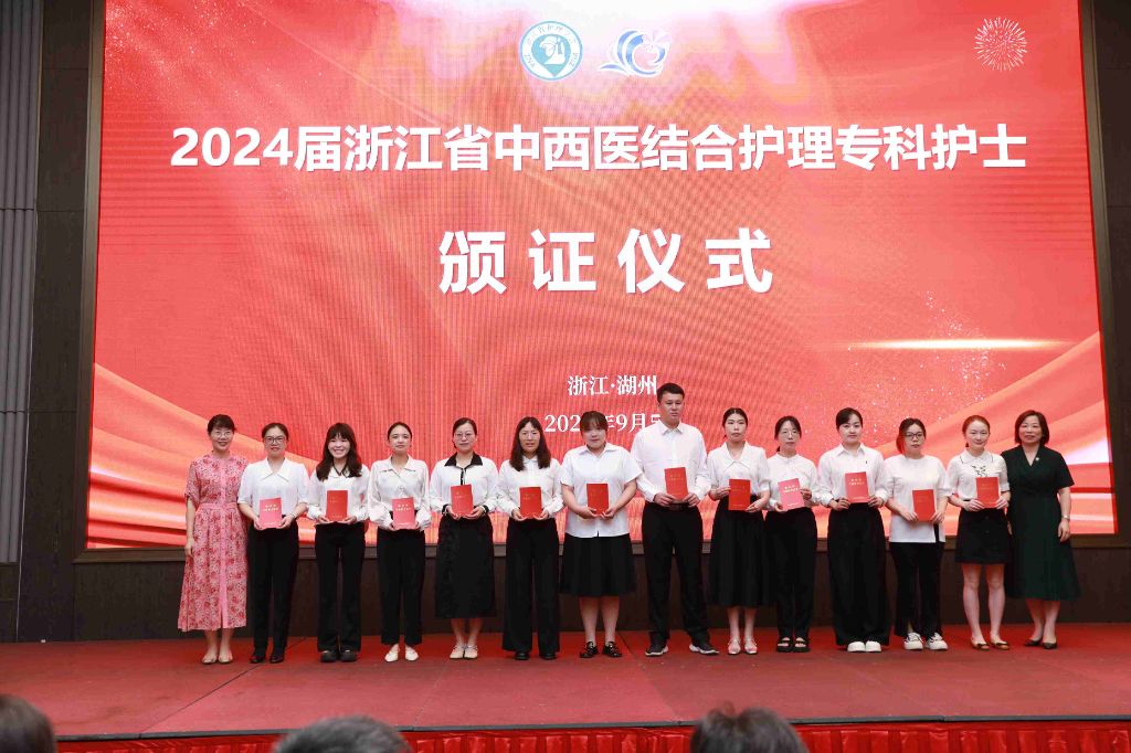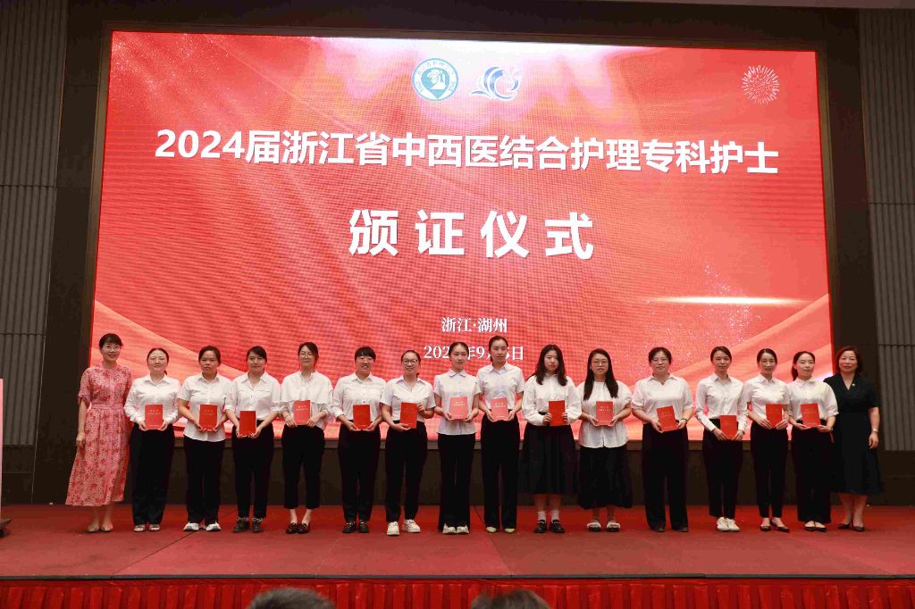 浙江省护理学会副理事长徐敏及副秘书长金瑛为2024届浙江省中西医结合护理专科护士颁发证书。