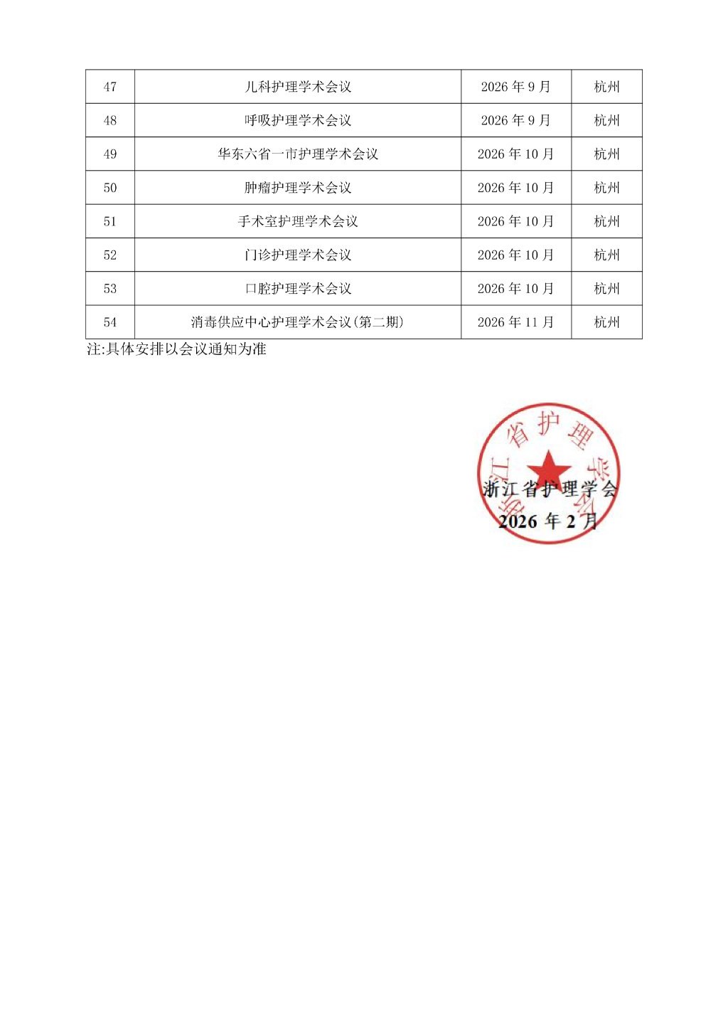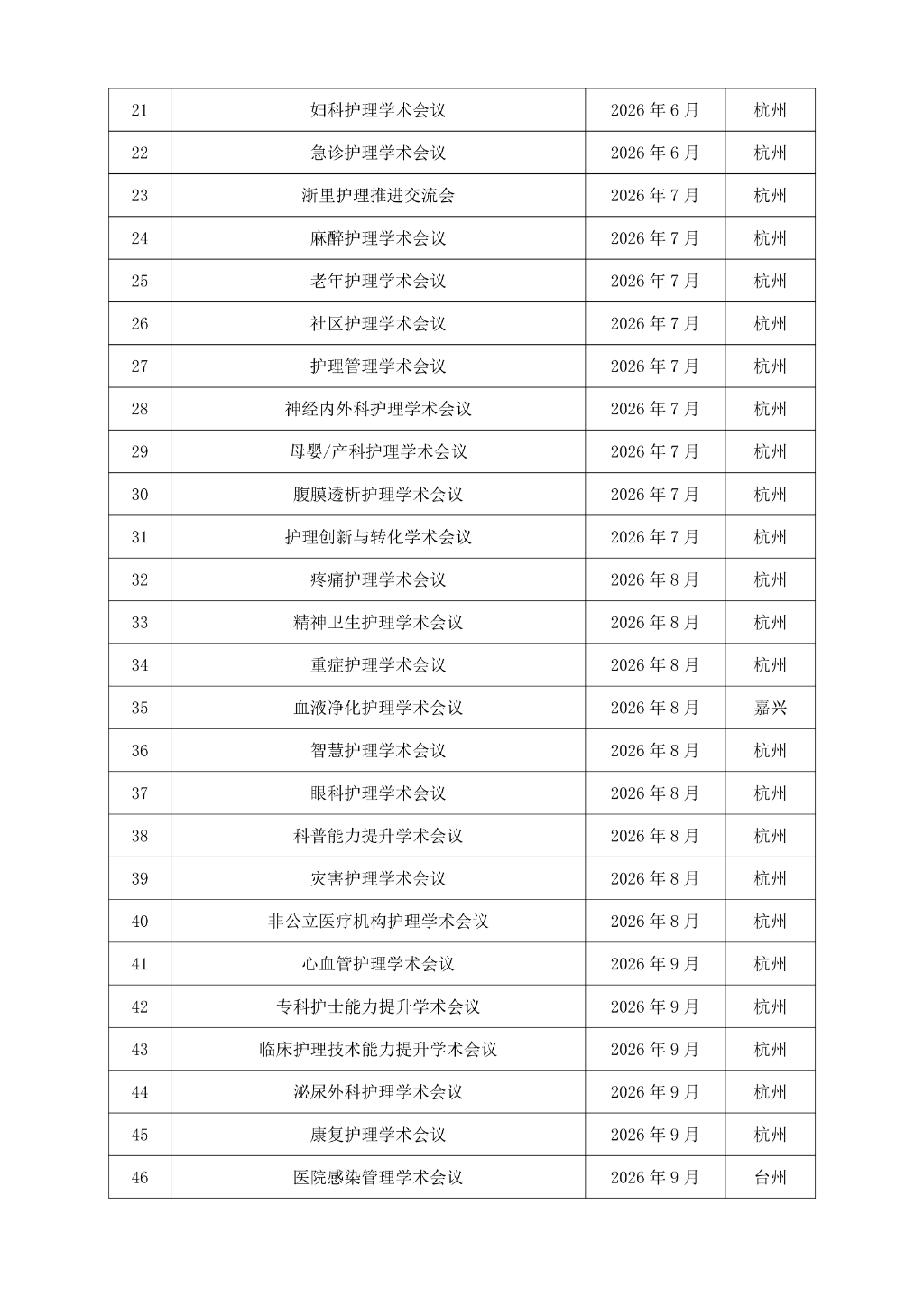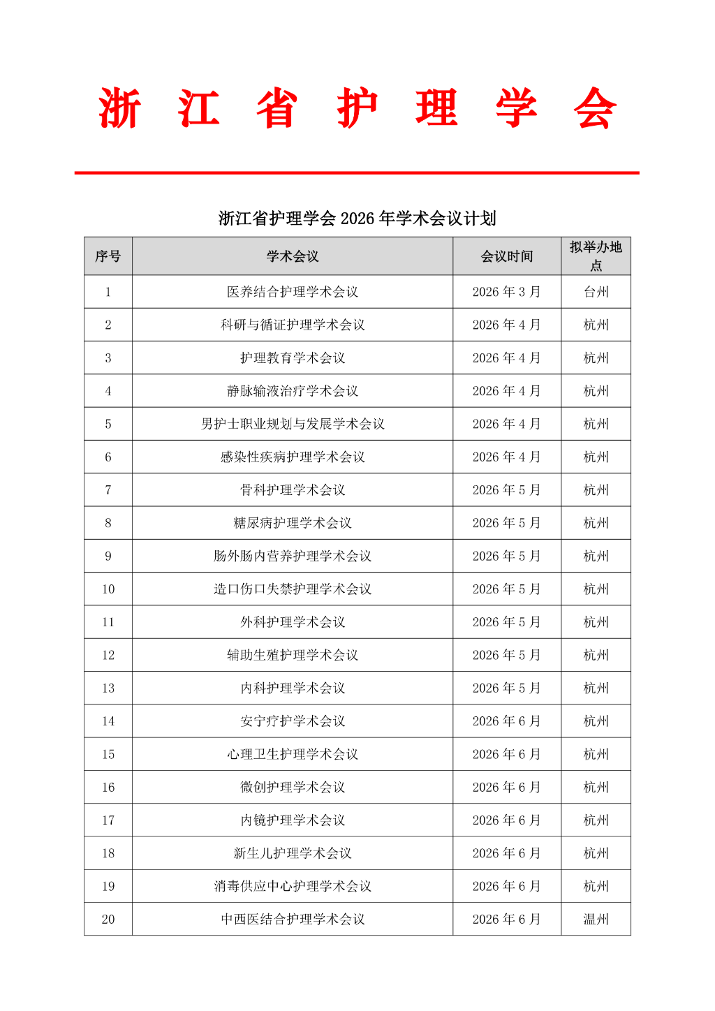 浙江省护理学会 2026 年学术会议计划