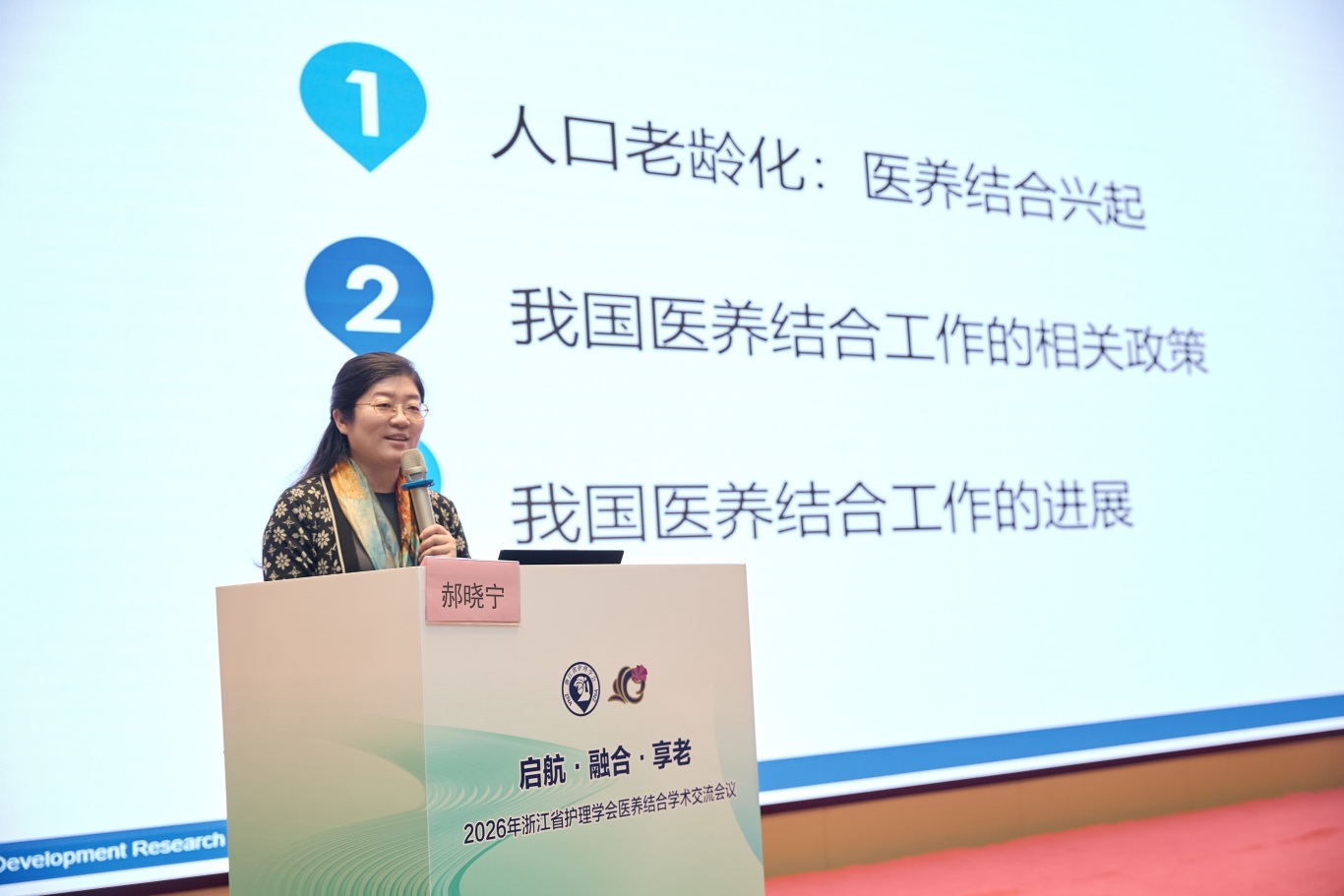主旨报告环节由郝晓宁副部长以《人口老龄化背景下的医养结合政策现状与发展》为题,立足老龄化新形势,系统解读国家及地方医养结合政策体系,梳理政策演进脉络、实施成效与现存堵点,精准剖析资源配置、服务供给、支付保障、人才支撑等现实困境。结合政策导向与行业实践,她展望医养结合高质量发展方向,提出优化政策协同、完善服务网络、强化医养康养融合、健全长期保障机制等关键举措,推动医养结合从“基础覆盖”迈向“优质服务”,以从容应对深度老龄化社会挑战。