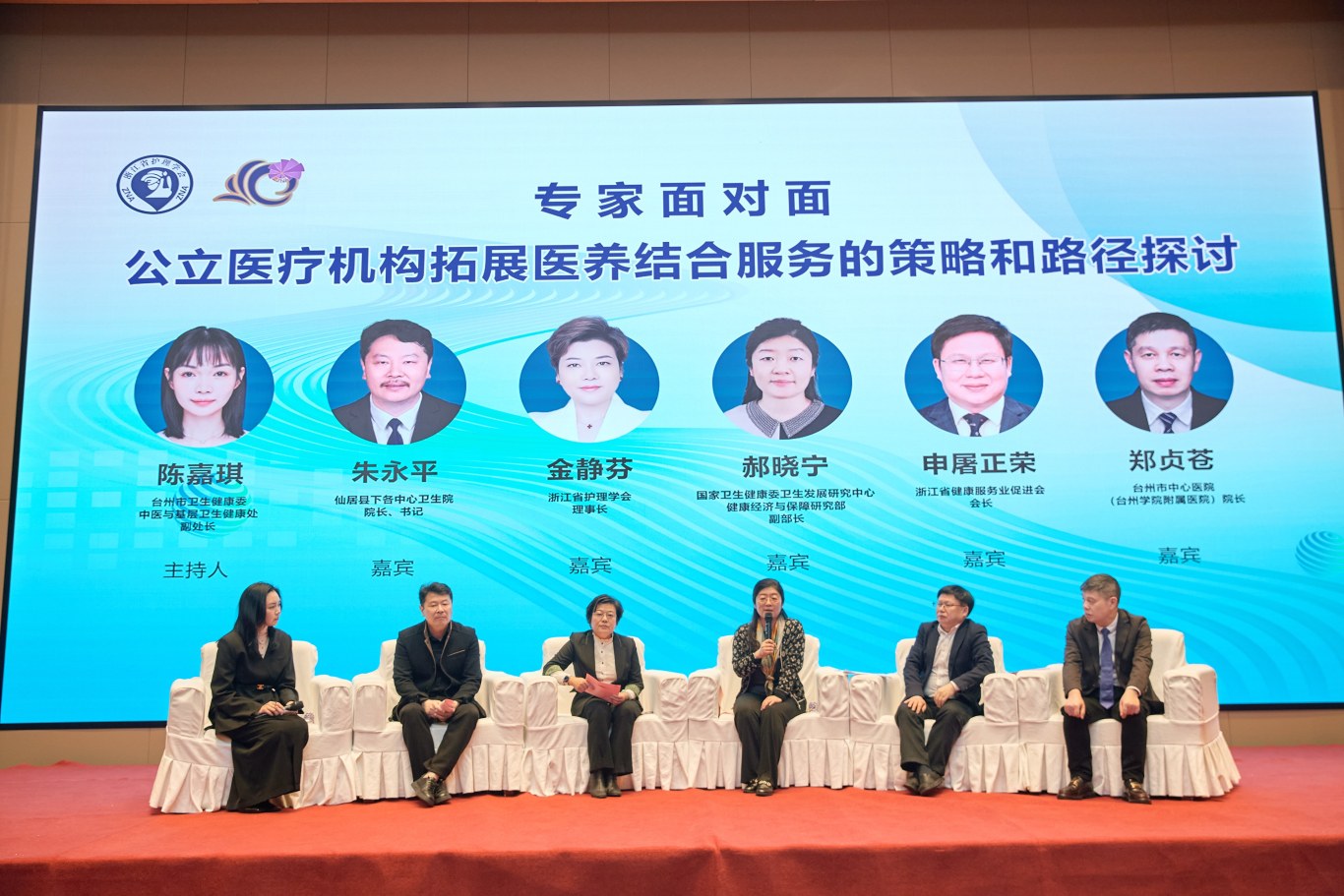 “专家面对面”以“公立医疗机构拓展医养结合服务的策略和路径探讨”为主题,由台州市卫生健康委中医与基层卫生健康处副处长陈嘉琪主持。国家卫生健康委卫生发展研究中心郝晓宁、浙江省健康服务业促进会会长申屠正荣、浙江省护理学会理事长金静芬、台州市中心医院院长郑贞苍、仙居县下各中心卫生院院长朱永平五位专家,围绕机制创新、模式构建、产业资源融合、服务延伸、不同级别医疗机构的作用、人才队伍建设等核心议题展开深度研讨。现场交流氛围热烈,观点碰撞、智慧交融,为公立医疗机构开展医养结合服务提供科学指引与实践参考。